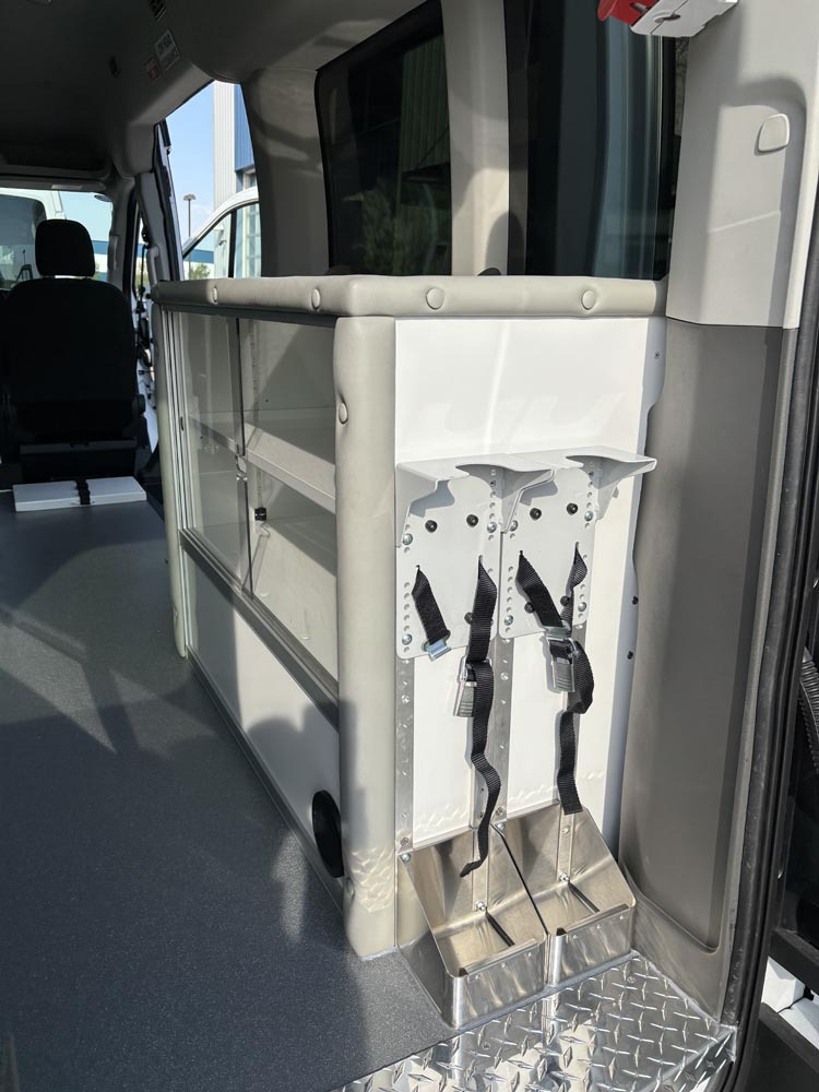 Built with the same know-how as Crestline ambulances, this patient transfer van is engineered for safe, comfortable non-emergency transport. The interior includes 4 rear seats and a medical cabinet fitted to hold two portable O₂ tanks. A factory-installed floor plate comes pre-wired for a Stryker POWER-LOAD system, while rear load lights, running boards, and an auxiliary heater ensure safety and comfort in all conditions.